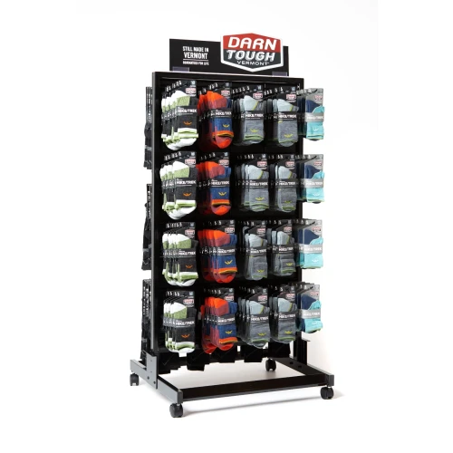 Darn Tough gulvdisplay på hjul, med plass til 240 par sokker. Ta kontakt med oss om du ønsker et slikt stativ.