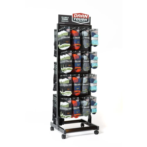 Darn Tough gulvdisplay på hjul, med plass til 144 par sokker. Ta kontakt med oss om du ønsker et slikt stativ.