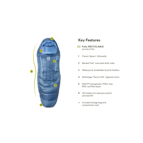 Along with this suite of top features, Disco now boasts the purpose-driven Endless Promise® designation, meaning it was designed specifically to stay out of the landfill and on the trail, forever. With a shell manufactured fully from PET, this sleeping bag is 100% recyclable at the end of its life — just send it back to NEMO, and we’ll handle the rest.