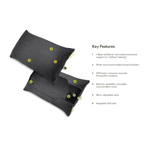 The interior features our baffled air cell structure to help it retain shape but is covered with a cozy layer of 100% post-consumer recycled Primaloft® insulation. An ultra-soft, machine-washable jersey cover is the final touch for a pillow that comfortably cradles your head with a width to accommodate broad-shouldered users, and pack size small enough for backpacking trips.