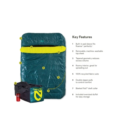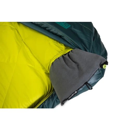 The overall design is symmetrical, with zippers on both sides to easily zip bags together, and a tapered geometry at the head and foot ends to reduce excess volume and keep the interior toasty. Our unique Blanket Fold™ draft collar is good for snuggling with and regulating body temperature, and a pillow pocket anchors your pillow in place. Best of all, when it’s time to pack up, keep your deflated sleeping pad in place and roll it up together with Jazz in the included oversized duffle for grab-and-go convenience. If you’re looking for the comforts of home for a night under the stars, Jazz hits the perfect note.