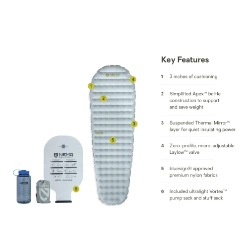 The lightest Tensor ever made, Tensor™ Elite is NEMO’s sleeping pad solution for hyper-streamlined hikers. Offered only in gram-shaving mummy silhouettes, the pad is made using 10D CORDURA® nylon and a single layer of Thermal Mirror™ insulation for an ethereal 240-gram weight. While Tensor™ Elite cuts out bulk, it’s still fully equipped with features: a 2.4 R-value, whisper-quiet construction, three inches of cushioning, and an improved Laylow™ valve that’s easier to use in all conditions.