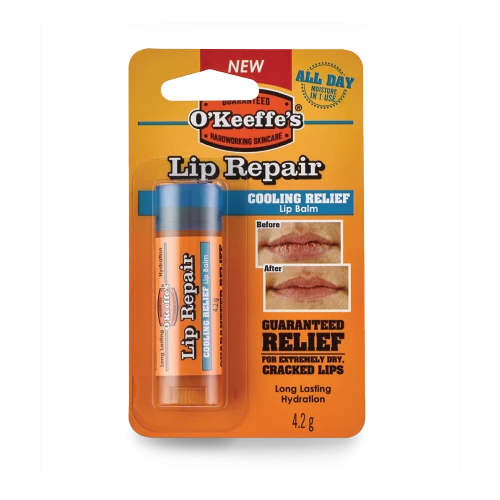 Hvis leppene dine er tørre og sprukne eller såre og ru, gir O’Keeffe’s Lip Repair umiddelbar lindring. Den svært effektive formelen lindrer, reparerer og gir fuktighet til ekstremt tørre lepper – og gir langvarig fukting hele dagen. Det er klinisk bevist at O’Keeffe’s Lip Repair gir fuktighet for en hel dag med én enkelt påføring. Dette er fordi den skaper en langvarig og fleksibel barriere, som tåler at du spiser og drikker.